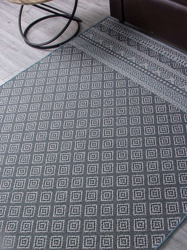 Коротко: «Ковер KAIR S154 BLUE» (KAIR, MERINOS) — ковер для дома, гостиной. материал: полипропилен, стиль: в современном стиле, цвет: серый, синий, тип ворса: Безворсовый, Циновка, плотность: 128000 точек/м², основа: джут, подходит для современного интерьера, страна производства: Россия.